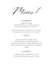 We offer a selection of signature menus for inspiration—but every event is unique. Custom menus can be created to reflect your personal tastes, dietary needs, or the theme of your occasion. Let us craft something unforgettable, just for you.